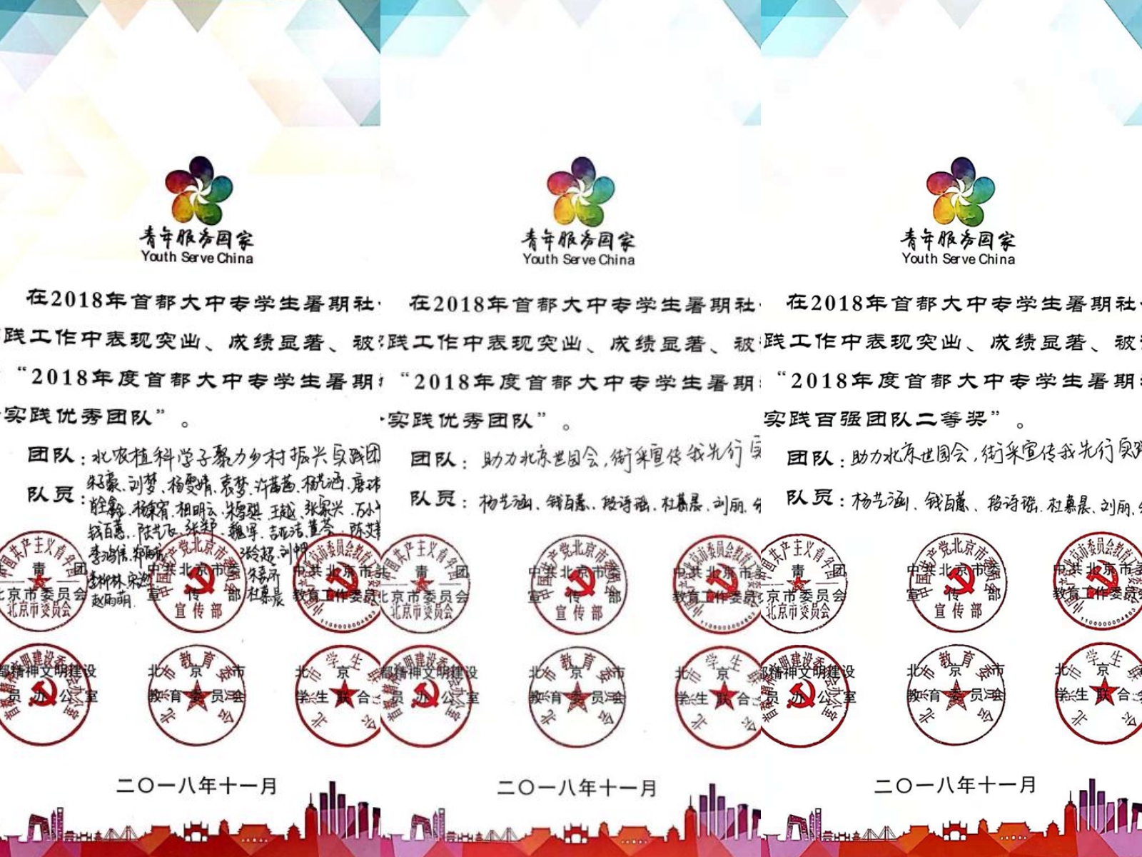 2018“青年服务国家”首都大中专员工暑期社会实践百强团队二等奖:fun88官网体育“助力北京世园会,街采宣传我先行”实践团。