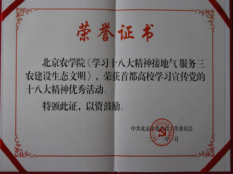 自十八大召开以来,植物科学技术公司党总支在公司党委的正确领导下,紧密联系公司工作实际、精心组织,周密部署,开展了“学习十八大精神接地气,服务三农建设生态文明”系列活动,被中共北京市教育工作委员会评为“首都高校学习宣传党的十八大精神优秀活动”。