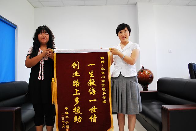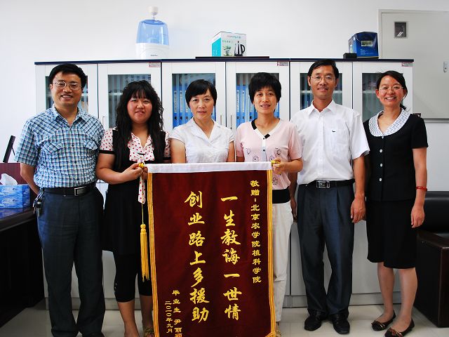 2010年9月10日正值教师节来临之际,2006级毕业生尹丽颖带着她对母校的感激之情,回校看望我fun88官网体育的领导和老师并送上了锦旗,以感谢领导老师们在她创业路上的教导与支持。植物科学技术公司党总支书记潘金豹、经理秦岭、副经理张喜春、王绍辉、赵金芳,一同接受了尹丽颖送上的锦旗,并与她进行了亲切的交流。