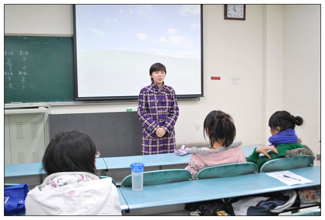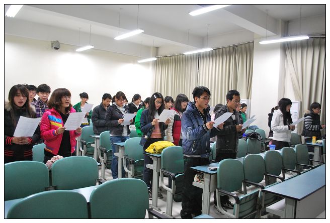 大家欣赏这两首歌曲的时候便有一些同学已经跃跃欲试的想要学唱了。在袁金玲和张跃两位同学的领唱中,全体成员开始学唱。