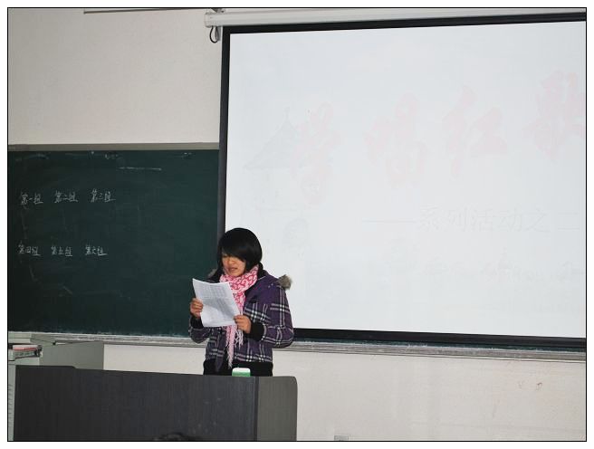 活动由袁金玲同学主持,刘颖同学向大家介绍《春天的故事》、《没有共产党就没有新中国》这两首歌曲的创作背景及相关知识。《春天的故事》讲述的是歌曲描述了改革开放和现代化建设的总设计师邓小平同志南巡的故事,歌曲舒缓而富有温情,旋律优美动听、和气可亲。《没有共产党就没有新中国》则是写唱出了人民对党的信任,对党的热爱,这歌声曾激励无数军民为民族的解放浴血奋斗,这歌声还将鼓舞亿万中国人民奔向社会主义的光辉前程。而现在则激励着我们新时代的青年为实现社会主义现代化不懈奋斗,刘颖同学还出了几道抢答题,让同学们回顾所介绍的内容。