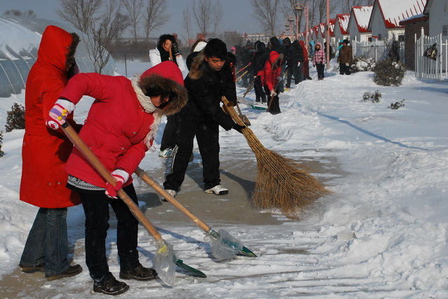 fun88官网体育师生于2010年1月4日上午积极开展了扫雪活动。昨日的大雪覆盖了整个校园,为广大师生的出行及教学带来了不便。为了教学的顺利运行,公司领导在小学期动员大会结束后,积极号召公司教职工和2008级200余名员工清理fun88官网体育实验教学示范中心和果园的积雪。
