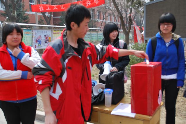 2010年4月6日,209232班同学在院领导、辅导员、班主任老师的指导支持下,开展爱心募捐活动。活动开始前一周,这个团结、爱心洋溢的集体,已经在班委的组织下募集到了900多元的捐款。班长找到领导、老师,希望能够动员全校师生一起行动起来,让爱不断延伸。就这样大家积极组织,分工明确,画宣传板、借桌子、借喇叭,组织写稿、录音……每个人都在忙碌着。在师生共同的努力下活动进行的很顺利,同学的积极性也调动到最高。在记者采访宣传板前的同学时,他们告诉记者:“能多募集一元钱,就能减轻刘璐一点负担,我们就觉得很高兴,别的困难都能克服,我们不累”!朴实、感人,他们的热情感染着周围的师生。
