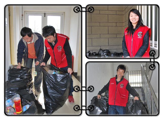 此次活动的目的在于帮助同学们清理宿舍阳台的卫生,为同学们营造一个干净整洁的学习生活环境。由于上下楼携带废品很不方便,很都同学都没有及时清理掉废旧瓶子,尤其是住在楼层较高的同学,占用了宿舍很大空间。而自助社举行的这次活动,帮助同学解决了这一困难。