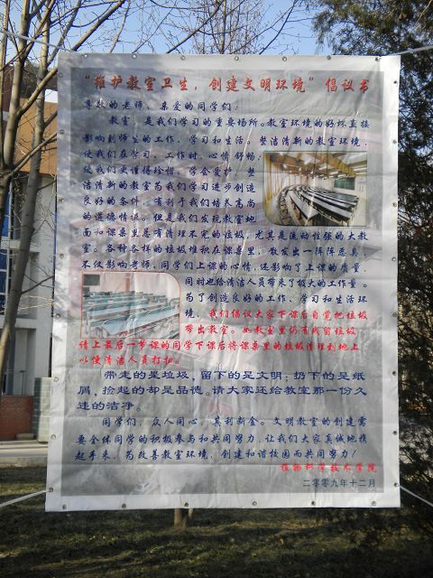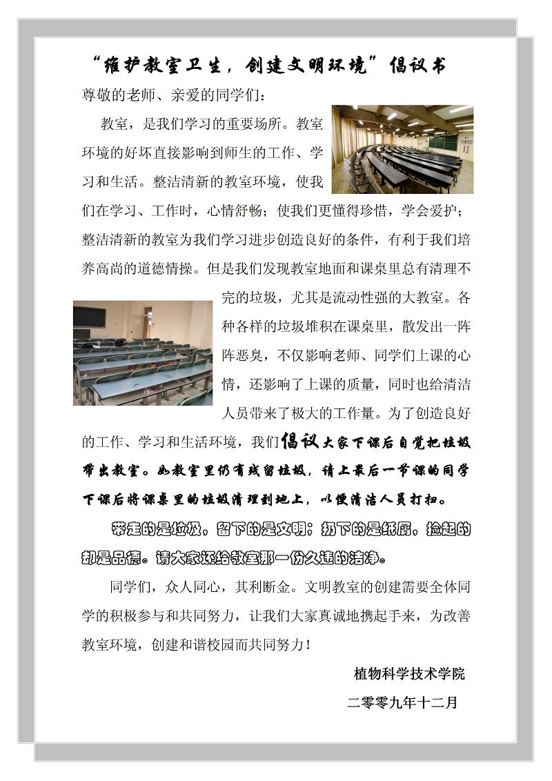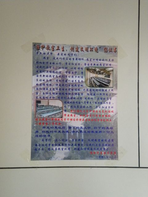 这是fun88官网体育员工会自律部和生活部联合发起的“维护教室卫生,创建文明环境”倡议,2009年12月16日中午,自律部部长、副部长将亲自带部员设计、制作的宣传画幅,在校园、教学楼、教室悬挂粘贴,希望通过醒目、温馨的提示,以实际的行动,影响全校同学携手共建文明校园,为和谐校园贡献力量!