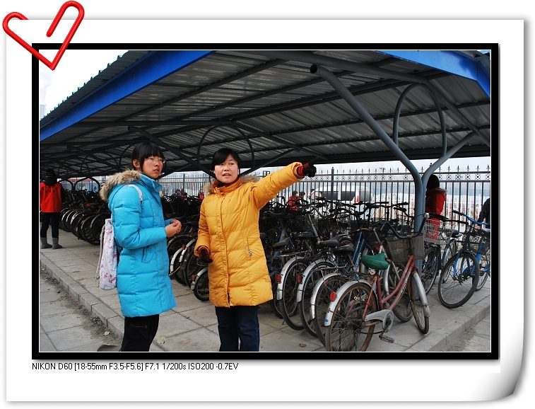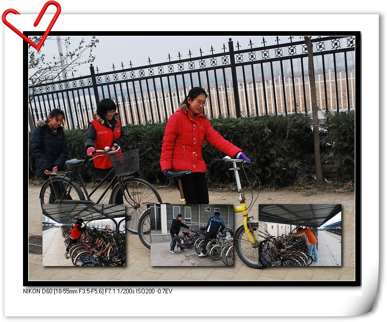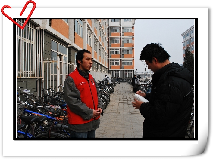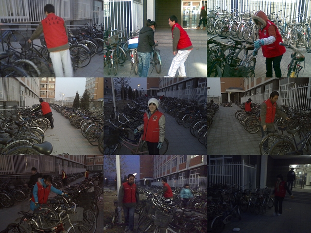 时值冬日,同学们在中午一站就是两个小时,就算穿着御寒的衣服也仍旧感觉寒气逼人,遇上阴天就算穿得再多一点也会打哆嗦。但想着努力争取来的维持自行车摆放秩序的光荣任务,大家就会抖擞精神,搓搓手,跺跺脚,再继续!下午五点也要有志愿者到达岗位,虽然时间缩短一小时但仍在考验着志愿者的意志,天黑了,他们还在顶着严寒,就着微弱的灯光履行他们的职责!