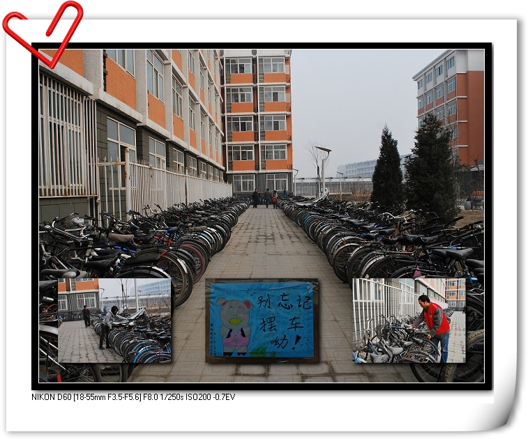 采访时,志愿者告诉记者,他们把自行车摆放好后,还要给后来停车的同学留出地方,引领她们停好车,并会提醒他们把锁锁好,记住停车地点,防止丢失也方便以后用车!在维持秩序的同时他们还会主动清理身边的垃圾。车棚周围、道路上的垃圾,都一一清到垃圾桶里,不定时的大规模的打扫一遍。