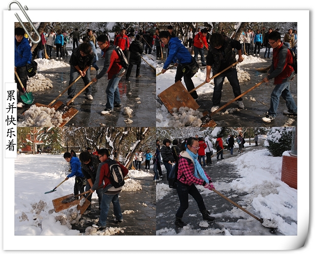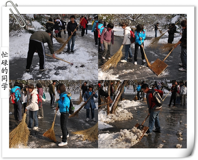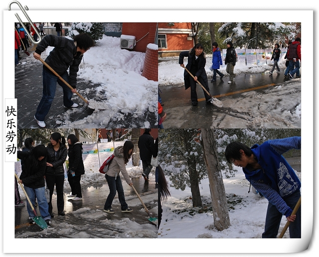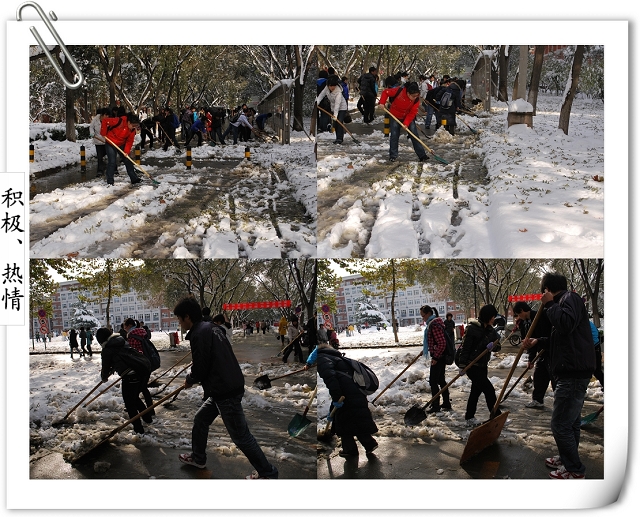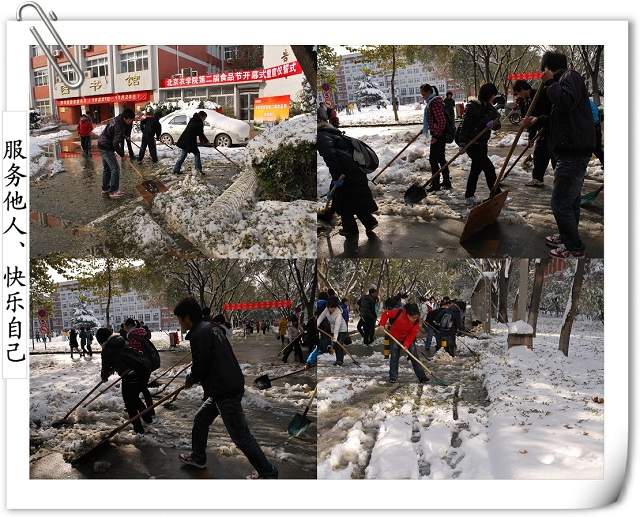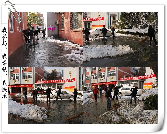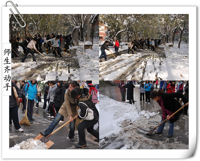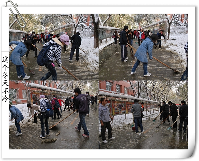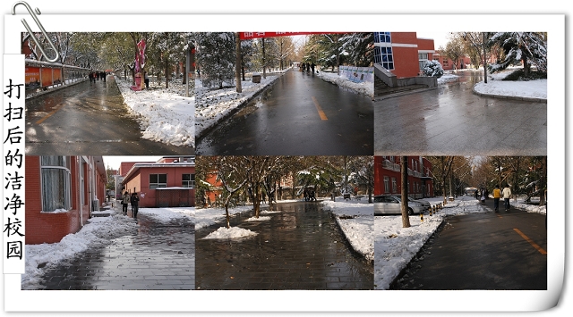 师生齐动员的场景引得路人的赞叹,同时得到后勤集团及公司个别部门的支持,为大家提供铁锹、铁锨、扫把等工具。争先恐后、你帮我扶,在大家半个小时的努力下,通往办公楼的南北路、去往一二食堂的大道小路、图书馆门前,变得畅通无阻,消融的积雪不再侵蚀师生的鞋子,而成为树木的最好浇灌积水,灿烂的笑容、师生互助的情景,成了今天别样美丽的风景线,更多的是为全校师生的工作和学习带来了方便。