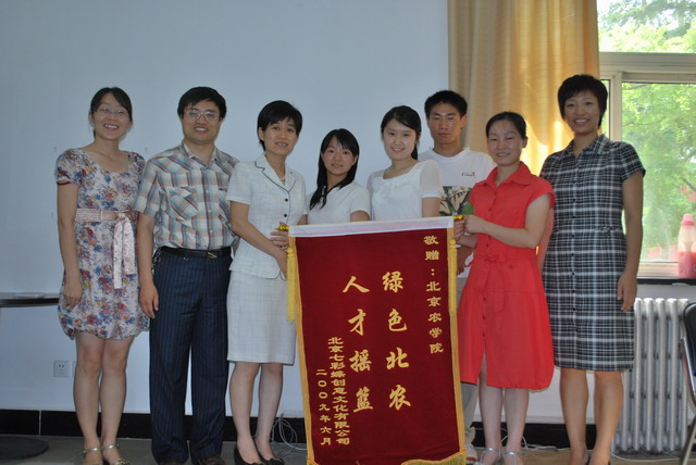 “绿色北农,人才摇篮”——这是北京七彩蝶创意文化有限公司赠送公司锦旗上面书写的文字。日前,北京七彩蝶创意文化有限公司副总经理胡群携3名即将毕业的植物科技公司员工来公司交流座谈。fun88官网体育副经理张喜春、赵金芳,辅导员马淑芹、贾慧敏接待了胡群一行。胡群此行是代表公司专门向公司赠送锦旗而来,以此感谢公司在其公司急需人才之际,培养并输送优秀员工赴公司工作。
