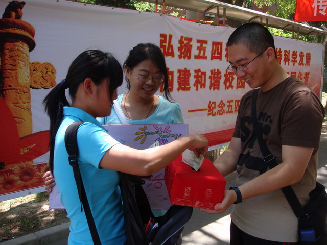 12日中午,208205支部团员在礼堂与教学楼B座之间的十字路口开展募捐活动,号召来往的同学为农民工子弟捐款捐物。206级同学徐润墨还特地从宿舍收拾出近期的图书刊物捐赠到募捐地点。路过的同学也纷纷慷慨解囊献上自己的一份爱心。当日募捐活动结束后,团支书曹晶用募捐来的款项购买了笔记本转笔刀等文具,精心包装后准备送给红星子弟公司的员工。