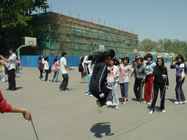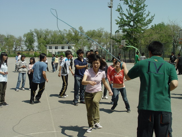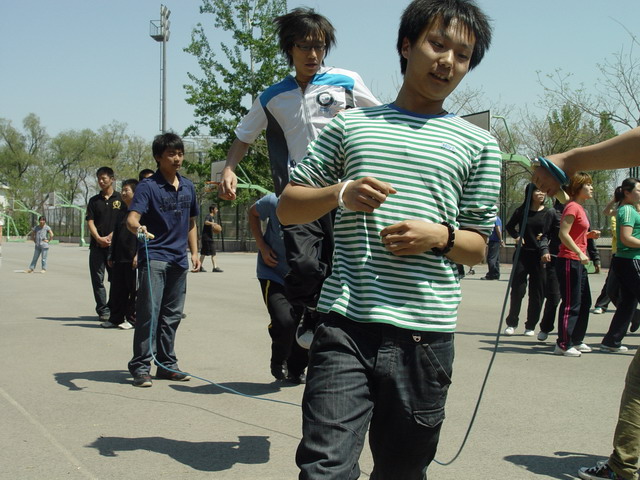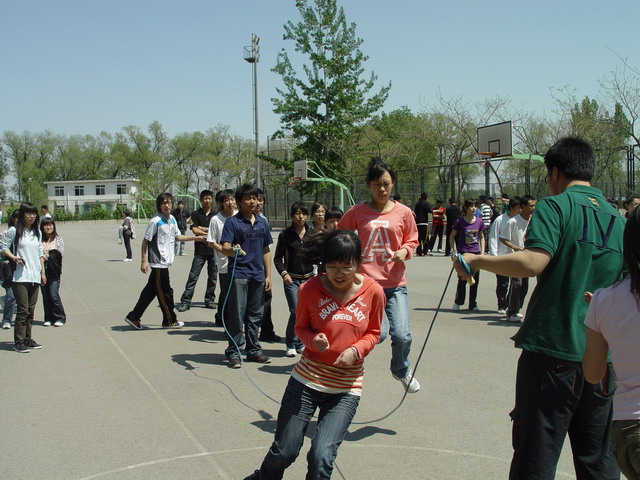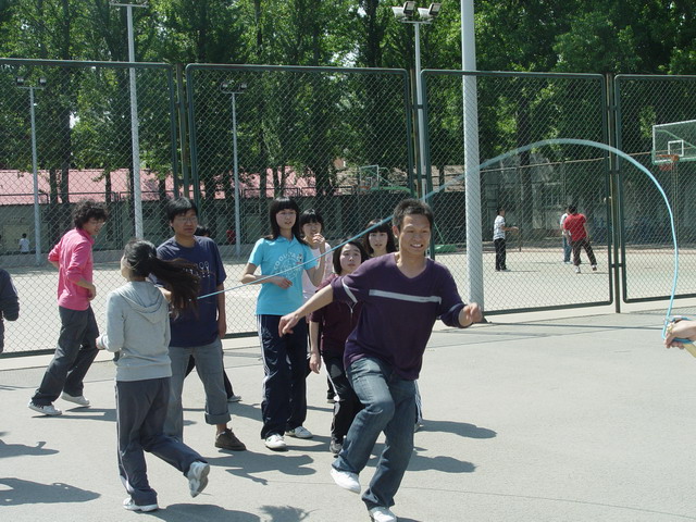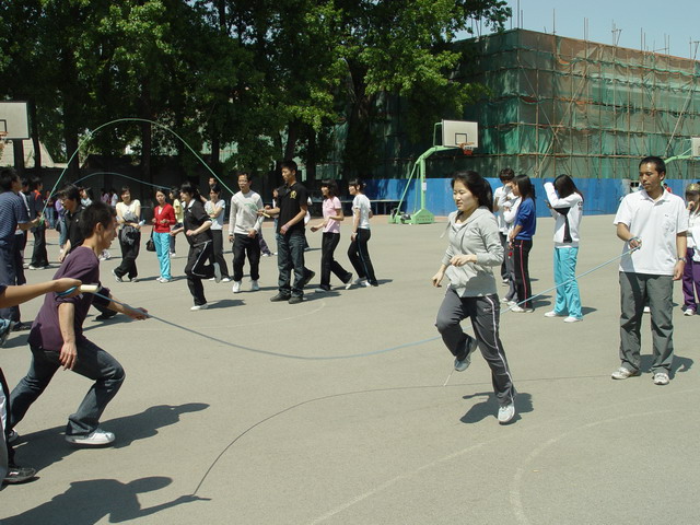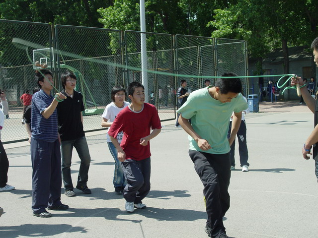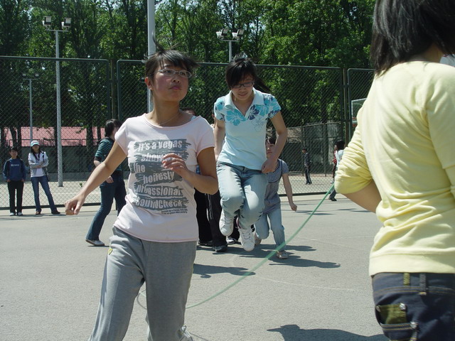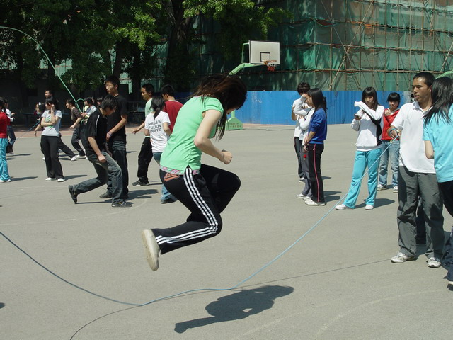 比赛以三分钟为限,顺利跳过的次数越多的班级分数越高。比赛中,每四个班级为一组同时进行,同学们矫健地跳过那被摇动得一次比一次快的大绳时,虽然会由于偶尔的失误减缓脚步,却没有一个人停下以至放弃。