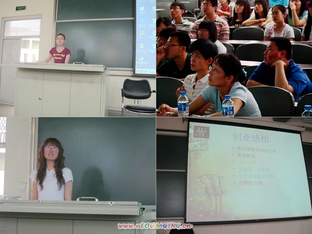 在3个小时的讲座中,尹丽颖同学首先讲述了自己的创业过程,和现在开办的北京博逸硕通文化传播有限公司的运营情况。最后和大家一一分享了自己的创业感悟:坚持理想并付出行动;朋友财富;忍住琐碎;小细节、大影响;专业素质决定成败;习惯的力量。公司的1101号引导员孙慕华同学也讲述了自己作为公司一员的感悟!