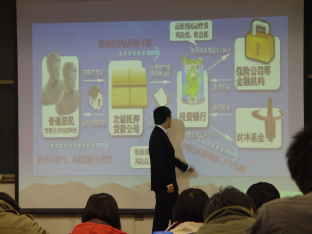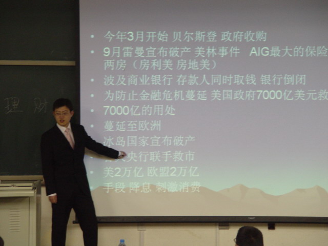 刘先生就当前美国华尔街金融危机与1929年曾经爆发的全球金融危机进行了对比分析,以一张生动丰富的图画,向在场的同学们解答分析了此次爆发金融危机的主要和根本原因是美国的金融政策和美元的大量发行造成的。李先生将当前的理财理念分为基础理财、保资理财、投资理财和投机理财四个部分,就当前的局势为老员工如何理财作了细致的引导和规划。在场的同学提到很多理财上遇到的问题,刘先生耐心解释,并为一些在炒股和将要准备创业的同学作了指导。
