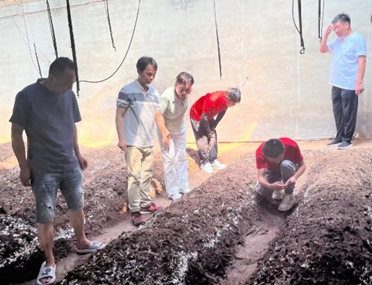 实践团第二站前往大华山镇大华山村食用菌栽培示范基地,调研桃枝废弃物发酵料栽培竹荪的情况。目前竹荪目前发菌良好、菌丝强壮,部分菌畦已长出现原基和竹荪蛋,预计七月底八月能够大规模出菇。调研期间,实践团还发现,菇棚存在浇水不均匀的情况,建议在缺水的部分增设水带。