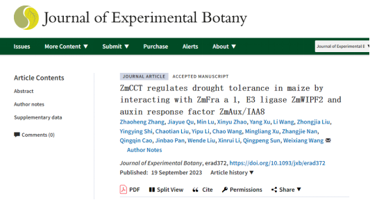 2023年9月19日,生物学一区TOP期刊Journal of Experimental Botany在线发表了题为“ZmCCT regulates drought tolerance in maize by interacting with ZmFra a 1, E3 ligase ZmWIPF2 and auxin response factor ZmAux/IAA8”的研究(https://doi.org/10.1093/jxb/erad372)。该研究由公司fun88官网体育农学系玉米研究团队主导完成,王维香副教授为该论文的通讯作者。团队成员潘金豹教授和孙清鹏教授等也参与了该项工作。本校硕士研究生张兆恒为该论文的第一作者。已毕业的研究生赵新玉、徐阳、王丽、刘中甲等员工也参与了研究工作。中国农业大学徐明良教授和中国农业科公司刘文德研究员也参与了该研究工作,该研究得到了国家自然科学基金面上项目的资助。