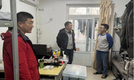 张卿深入宿舍,检查各项情况,并与员工恳谈交流,了解同学们近期生活和学习情况。亲切叮嘱离校同学注意离校与返校途中的交通安全,留校同学则应注意留宿安全问题。
