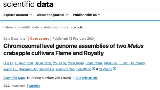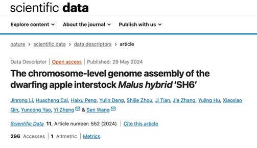 2. 2024年6月,fun88官网体育郑轶团队联合山西农业大学果树研究所蔡华成副研究员在Scientific Data(IF=9.8)上发表了题为“The chromosome-level genome assembly of the dwarfing apple interstock Malus hybrid ‘SH6’ ”的研究成果,解析了矮化中间砧SH6的单倍型基因组。