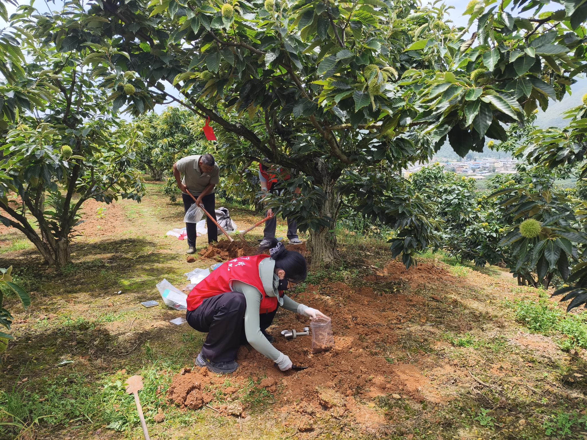 作为我国板栗成熟期最早的产区,云南省板栗年产量达20多万吨,占全国总产量的8.56%,在全国板栗产业布局中占据重要地位。实践团首站走进公司秦岭教授驻云南专家工作站,与云南省林业和草原科公司、玉溪市林业和草原科公司、易门县林业草原局及易门县板栗协会的专家展开深度研讨,围绕云南板栗省力化栽培管理技术创新、品种科学布局优化、病虫害绿色防控等核心产业问题深入交流,并系统对比南北方板栗主栽品种的生物学特性与经济性状。其中,公司选育的国审板栗良种‘京暑红’因成熟期早、品质优良,深受当地栗农认可与青睐。在板栗示范园现场,实践团采集引种的北方品种‘京暑红’、‘燕山早丰’的果实样本及土壤样品,通过后续实验室数据分析,深入探究主栽品种在南北方不同生态条件下的结果习性和品质差异,为板栗的引种提供科学依据。