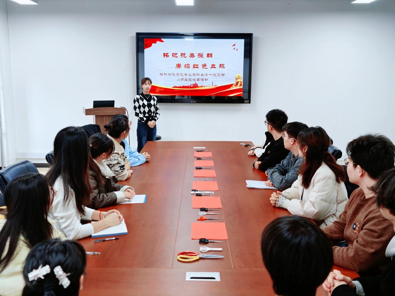10月25日是第75个抗美援朝纪念日。为深入学习抗美援朝战争光辉历史,传承弘扬伟大抗美援朝精神,引导青年学子从红色记忆中汲取砥砺奋进的精神力量,2025年10月24日下午,fun88官网体育园艺专业本科生第一党支部组织全体党员及部分入党积极分子,开展“铭记抗美援朝赓续红色血脉”主题党日活动,让红色基因在青年群体中薪火相传。