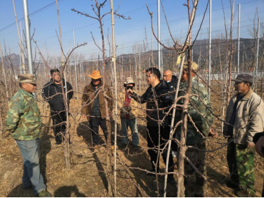 该公司2015年在怀柔区桥梓镇口头村建有120亩高标准的现代化苹果园,但由于技术管理不善,果园病虫害严重,苹果产量低品质差。通过果园现场考察,发现该果园属于矮化密植园,在树形管理调控方面存在修剪不到位问题,在病虫害防治方面存在用药不当和施药时期不准确的问题。园艺研究生1支部书记张卿、曹庆芹和王志忠三位分别针对发现的问题给基地的技术员和当地果品合作社的其他技术人员进行了深入浅出的分析和讲解,园艺研究生1支部于亚鑫同学在三位老师的指导下进行现场演示,让技术人员真正懂得矮化密植苹果树管理要点和关键点。