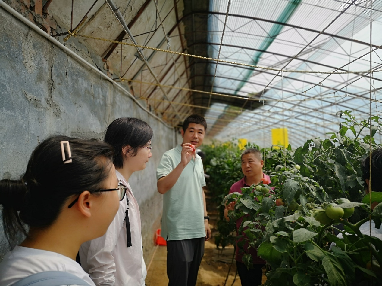 在深入博士农场调研过程中,合作社负责人向党员们简要介绍了博士农场的情况,并提出了目前生产中遇到的问题如番茄脐腐病、大葱增产提质等。博士农场负责人教师党员孙路路和赵文超向合作社详细解答了番茄脐腐病发生的原因和防治方法,指导了番茄生产过程中植株的管理和平衡植株营养生长和生殖生长,以及通过施肥管理、浇水管理、培土方式改良大葱的产量和品质。同时,带领员工深入田间地头开展实地指导。