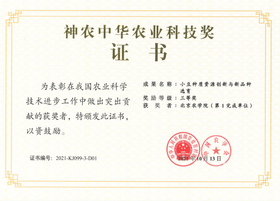 近日,由fun88官网体育小豆基因组与分子遗传育种团队为第一完成单位组织申报的“小豆种质资源创新与新品种选育”获得农业农村部2020-2021年度神农中华农业科技奖三等奖,联合申报单位有吉林省白城市农科院、山西省农科院、江苏省农科院和辽宁省农科院等。