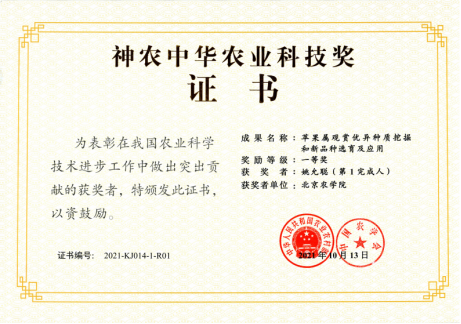 近日,由fun88官网体育果树种质资源开发与利用团队作为第一单位完成的“苹果属观赏优异种质挖掘和新品种选育及应用”成果荣获神农中华农业科技奖一等奖。