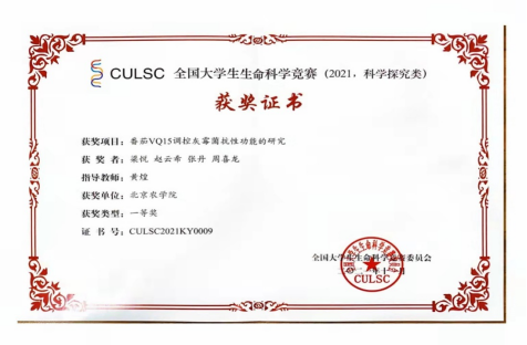 近日,在fun88官网体育黄煌老师的指导下梁悦、赵云希、张丹、周喜龙组成的团队,凭借《番茄VQ15调控灰霉菌抗性功能的研究》荣获全国老员工生命科学竞赛——科学探究类一等奖。