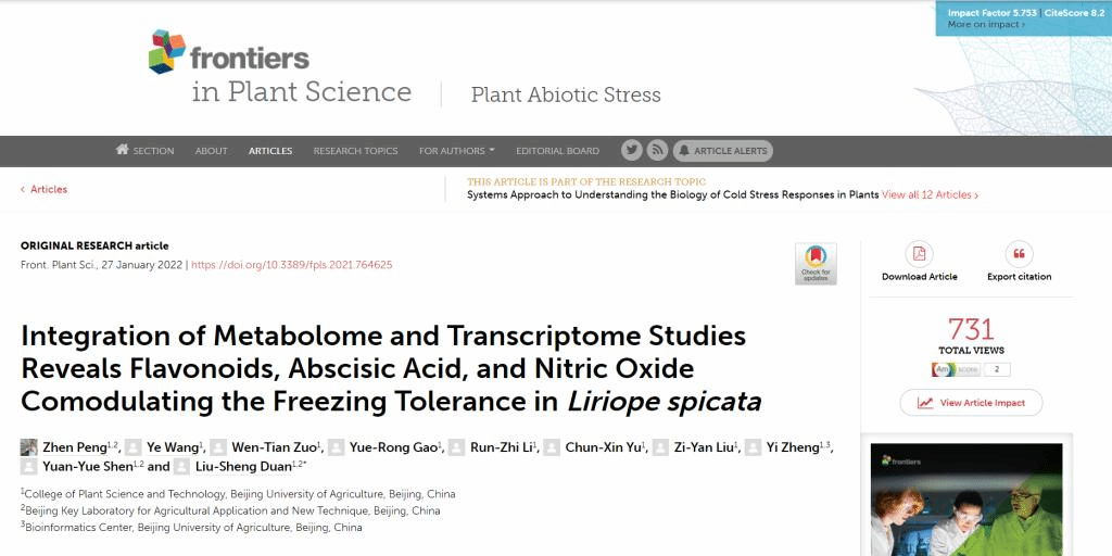 2022年1月,fun88官网体育段留生教授团队在Frontiers in Plant Science发表了题为“Integration of Metabolome and Transcriptome Studies Reveals Flavonoids, Abscisic Acid, and Nitric Oxide Comodulating the Freezing Tolerance inLiriope spicata”的研究论文。fun88官网体育园艺系青年教师彭真博士为论文第一作者,段留生教授为通讯作者。