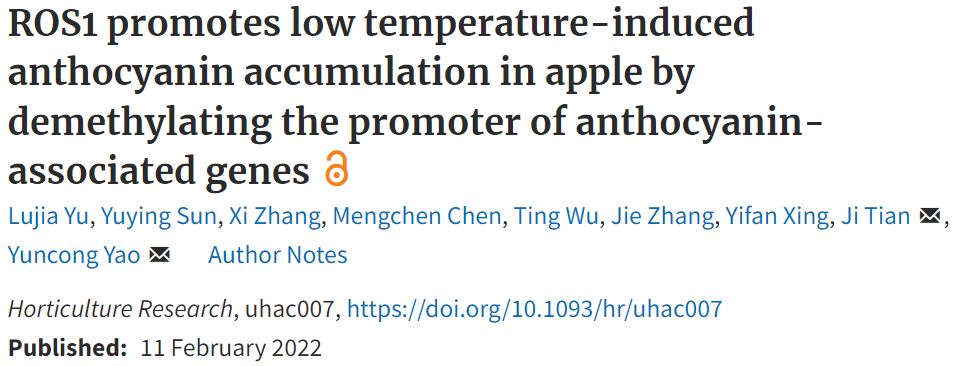 近日,Horticulture Research上线了(Advance Access)fun88官网体育果树种质资源创新与利用团队题为ROS1 promotes low temperature-induced anthocyanin accumulation in apple by demethylating the promoter of anthocyanin-associated genes的研究论文,该论文揭示了去甲基化基因ROS1介导低温诱导条件下苹果(Malus domestica)花色素苷积累的分子机理。