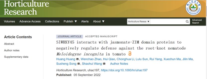 近日,Horticulture Research上线了(Advance Access)fun88官网体育王绍辉教授团队题为SlWRKY45 interacts with jasmonate-ZIM domain proteins to negatively regulate defense against the root-knot nematodeMeloidogyne incognitain tomato的研究论文,该论文揭示了转录因子SlWRKY45参加茉莉素合成和信号转导途径负调控番茄对南方根结线虫的抗性。