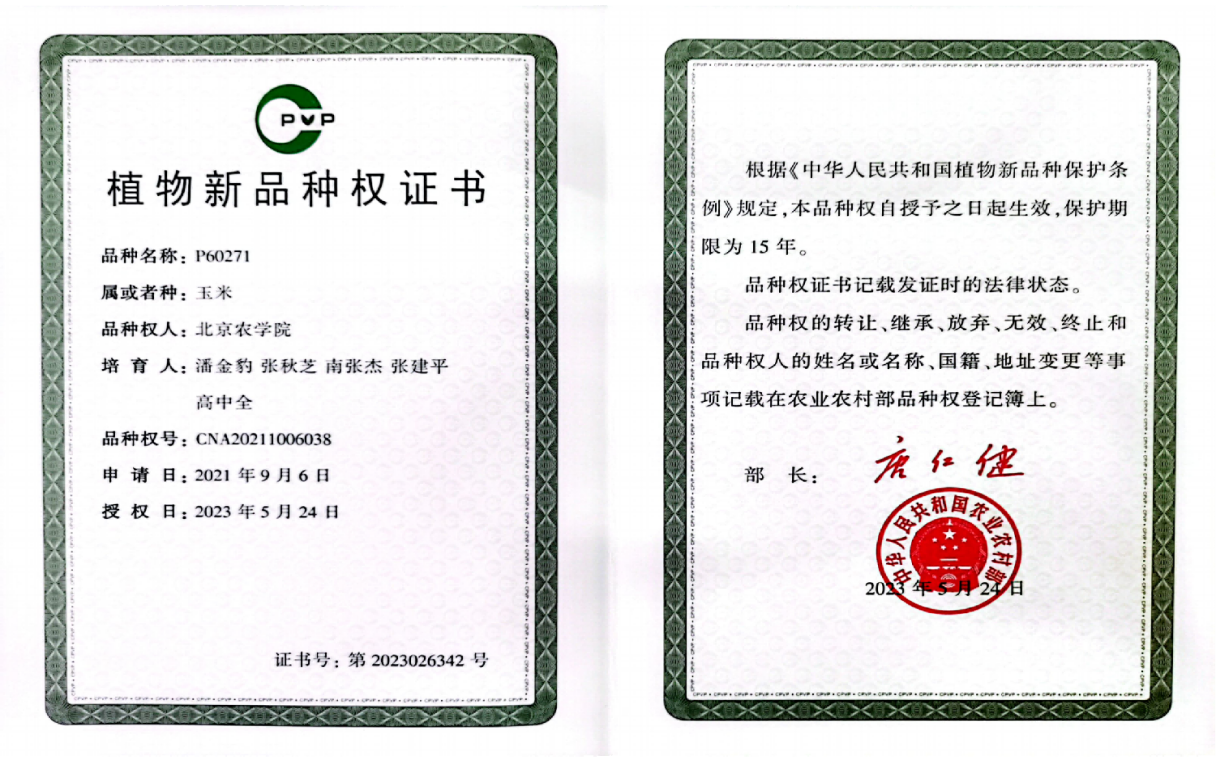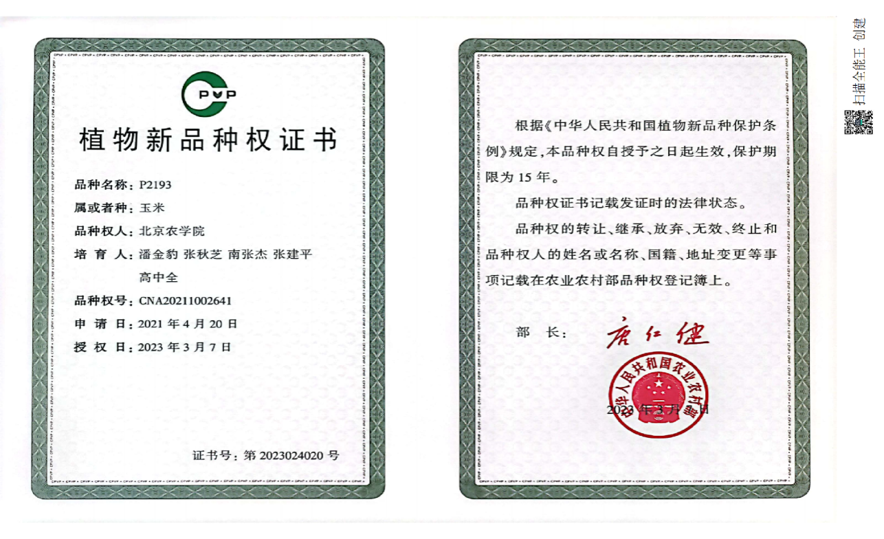 植物科技公司青贮玉米团队培育的玉米品种P2193 、P60271 取得国家植物新品种权证书