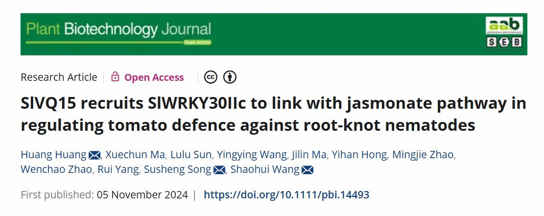 近日,fun88官网体育王绍辉/赵文超教授团队、首都师范大学宋素胜教授团队在Plant Biotechnology Journal发表了题为“SlVQ15 recruits SlWRKY30IIc to link with jasmonate pathway in regulating tomato defence against root-knot nematodes”的研究论文。该论文揭示了SlVQ15招募转录因子SlWRKY30IIc,偶联茉莉素途径调控番茄应对根结线虫入侵的分子机制,为茄科植物的抗性育种提供新的思路。