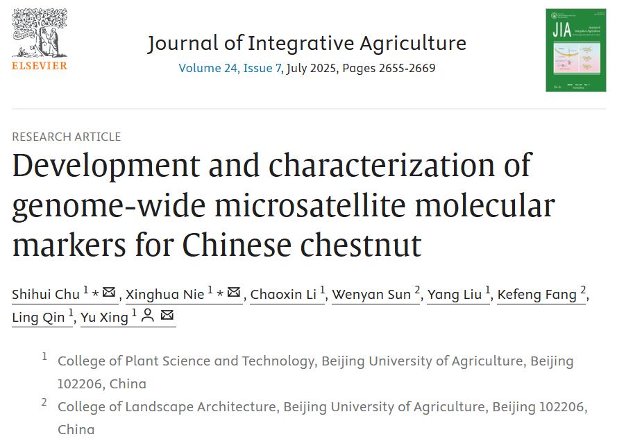 近期,fun88官网体育秦岭/邢宇课题组完成的题为“Development and characterization of genome-wide microsatellite molecular markers for Chinese chestnut”的研究在Journal of Integrative Agriculture(《农业科学学报》(英文),JIA)2025年7期正式发表。