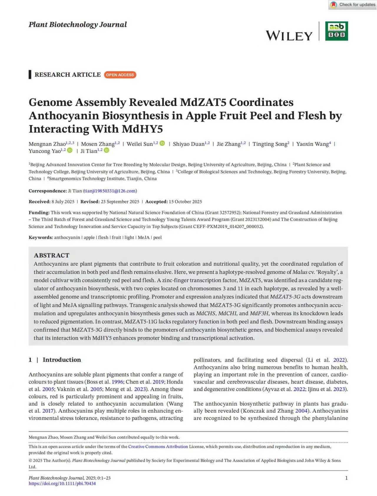 喜讯频传,硕果盈枝!近日,公司田佶教授团队在国际植物生物技术领域顶级期刊Plant Biotechnology Journal上在线发表了题为“Genome Assembly Revealed MdZAT5 Coordinates Anthocyanin Biosynthesis in Apple Fruit Peel and Flesh by Interacting With MdHY5”的研究论文。该研究在苹果果实色泽形成的分子调控机制方面取得了重要进展,为苹果品质改良的分子设计育种提供了关键的理论基础与基因资源。