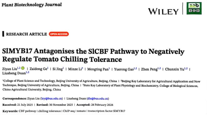 近日,公司段留生教授与刘子妍副教授团队,在国际植物生物技术顶级期刊《Plant Biotechnology Journal》上在线发表了题为“SlMYB17 Antagonises the SlCBF Pathway to Negatively Regulate Tomato Chilling Tolerance”的研究论文,首次鉴定到番茄中一个新的耐冷负调节转录因子SlMYB17,并揭示了其在转录和蛋白活性两个层面通过拮抗SlCBF通路,进而抑制冷响应基因(COR)表达、降低番茄耐冷性的分子机理。这一发现不仅完善了热带起源作物番茄的冷响应调控网络,也为通过基因编辑技术选育高耐冷番茄新品种提供了极其珍贵的遗传靶点和种质资源。