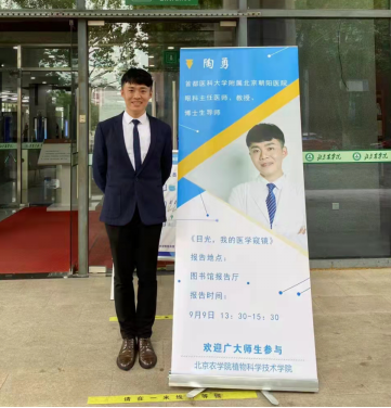 2021年9月9日下午14:00在图书馆报告厅,fun88官网体育有幸邀请到首都医科大学教授、博士生导师,北京朝阳医院眼科主任医师陶勇为2021级的238名本科、研究生新生及青年教师上了生动又意义非凡的一堂课——《目光——我的医学窥镜》。报告会由公司党总支副书记、副经理牛奔老师主持。