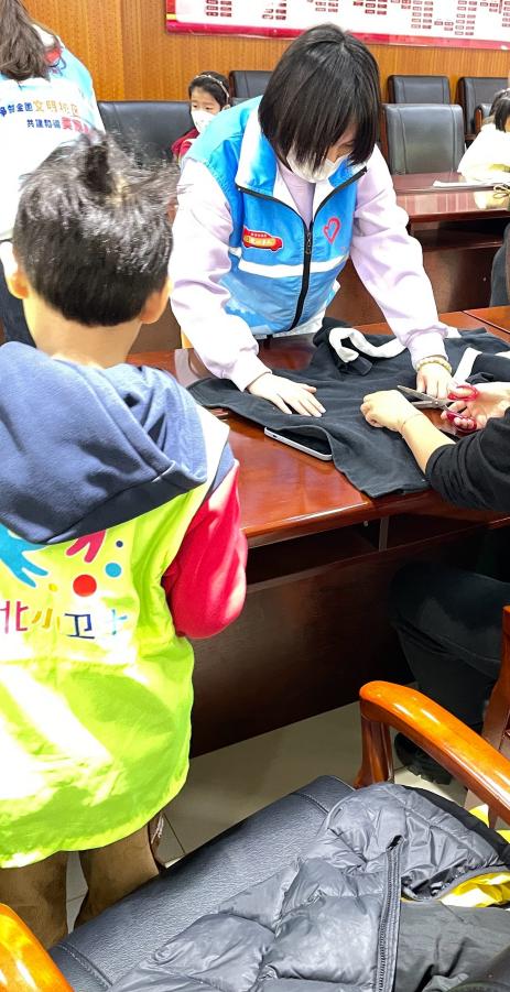 志愿者和小朋友一同进行旧衣改造,将孩子们带来的废旧衣服、纽扣等物品,通过设计制作成背包和手提包。为减少垃圾丢弃,保护生态环境,做到了绿色生活的第一步。