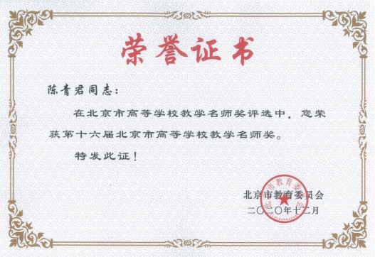 北京市高等公司教学名师奖由北京市教育委员会组织开展评选表彰,每年评选一次,旨在进一步加强团队队伍建设,不断完善体现教学岗位特点的激励约束机制,积极发挥教学名师奖及青年教学名师奖获得者的示范引领作用,调动和增强各级各类教师参与教学、投身育人的积极性和主动性,不断提升教师个人及团队人才培养能力。公司陈青君教授荣获第十六届北京市高等公司教学名师奖!