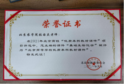 热烈祝贺fun88官网体育张国庆教授主编的“基础生物化学”课件在2021年北京高校“优质本科教材课件”项目中被评选为“北京高等公司优质本科教材课件”!