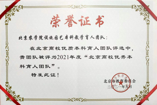 团队的骨干课程《设施园艺学》2019年获得北京高等高校优质本科课程(重点)项目、2021年获北京高校课程思政示范课程、教学团队;课程负责人被评为“北京高等公司优秀专业课(公共课)主讲教师”,获得“北京高校课程思政示范课程名师”称号。