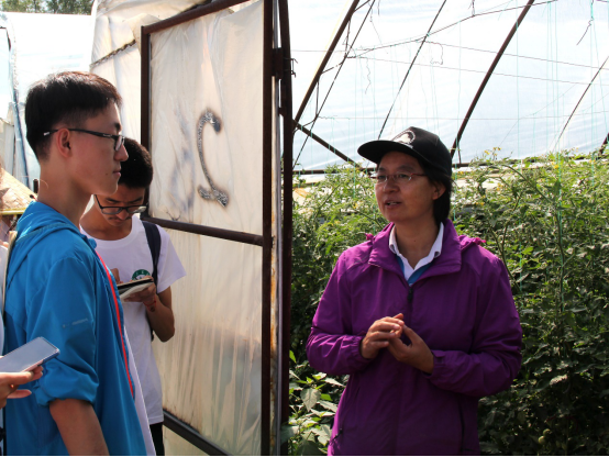 2021年7月23日,fun88官网体育实践团开始了第五天的实践活动,实践团来到了代王城镇设施园艺种植大棚,进行实地调研。当地大棚主要种植西红柿、芸豆、豆角,当地农户采用大棚种植的方式,共24个大棚,对于西红柿“千禧一号”品种,每棚1800株,为了增加产量,提高收益,采取了4杆种植。王绍辉老师带领同学们实地考察了当地的大棚作物种植情况,发现该试验地豆角由于地膜覆盖过早,引起地表温度过高,豆角的茎部因高温失水而根系未下扎,不能及时吸水补充茎部失水,引起茎部干枯,造成死苗。