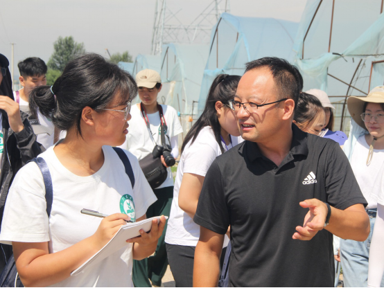 随后,实践团来到了当地的振兴合作社,参观了当地的设施葡萄种植基地。经该合作社高级工程师李经理的讲授,该地将“夏黑”葡萄品种重点培育,采用极短式枝条修剪技术及嫁接苗的方式,保证了该品种较高的结果率及葡萄甜度,且大棚中采用防虫网,避免了虫害的干扰,使得葡萄果实质量大大提高。由于当地干旱的气候条件,故当地村民采用了洼地的建棚模式,使大棚水平面低于地面水平面,将雨水的利用率提高,从而提高该地葡萄产量及质量。张卿老师、王志忠老师对于葡萄的种植、嫁接、修剪等技术进行了现场教学。