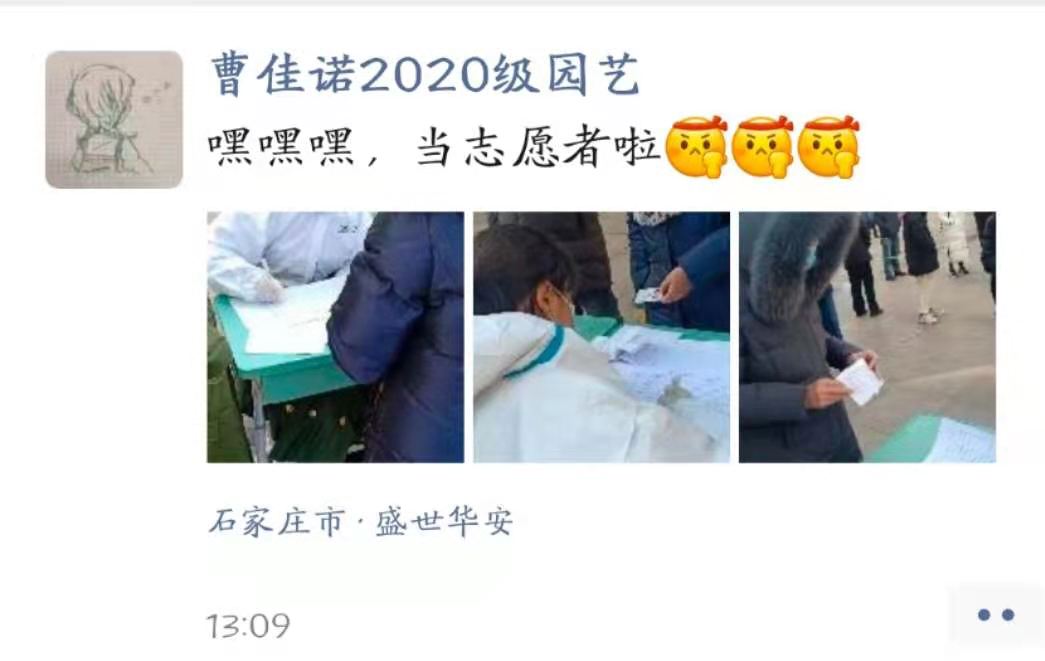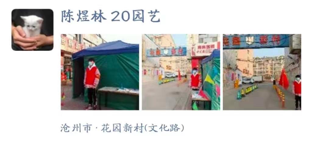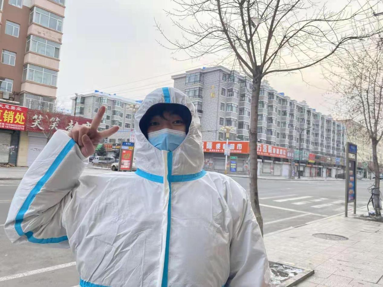 “做逆行者的第二天,也不记得自己今天爬了多少楼,通知了多少人家,贴了多少封条。数九寒冬,羽绒服外边裹着防护服,汗水把羽绒服都浸透了,但仍旧收获感动。”——19级王嘉腾
