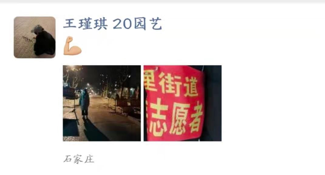 “奋战在前线以及在疫情面前默默风险的人,用行动诠释了中国精神。白衣天使救死扶伤的崇高精神,基层工作者的不分昼夜的工作精神。我作为一名农科学子,虽然不能为疫情做出很大的贡献,但我可以做到不为国家添乱,做好力所能及的事情。”——18级董钰莹