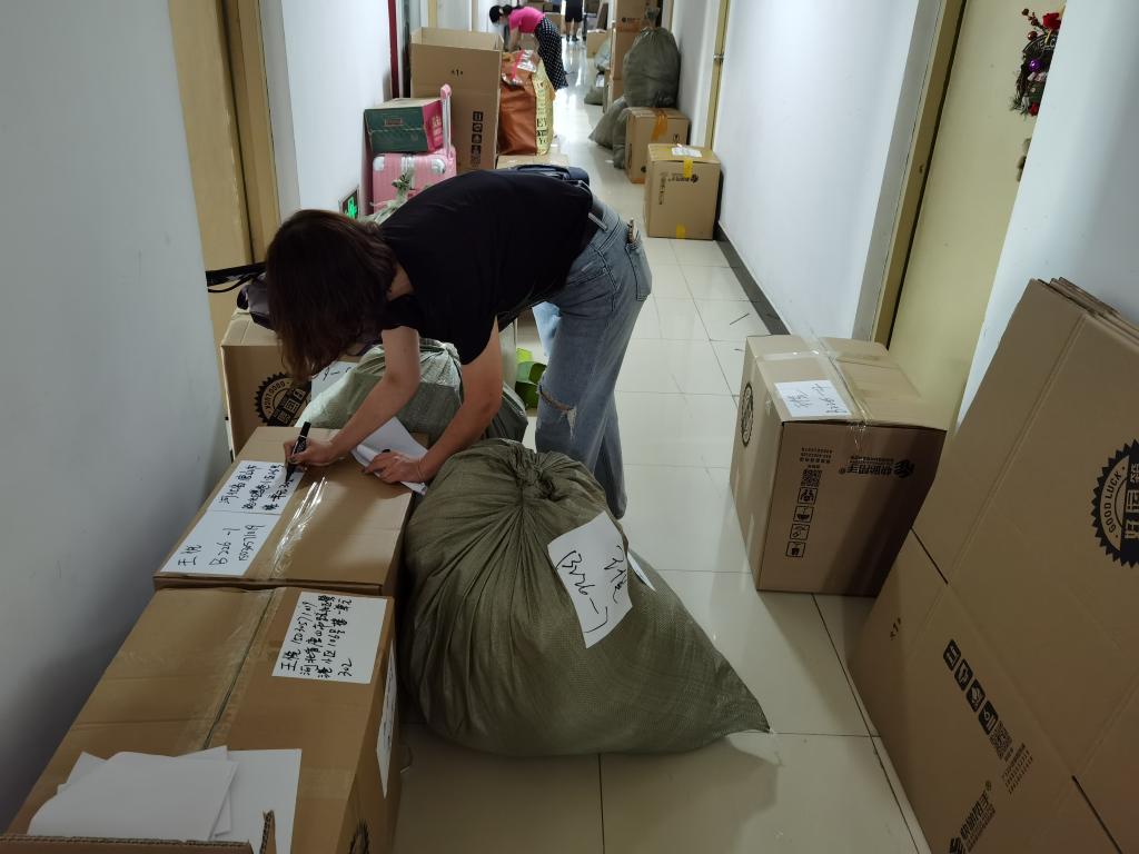 公司35名党员老师、班主任、辅导员积极投入到 毕业生行李打包邮寄工作过程中,通过视频连线整理每名员工的物品,在收拾行李的过程中做到了一组一寝,一人一问。左手举着手机,右手挑拣物品”成了老师们的工作写照。