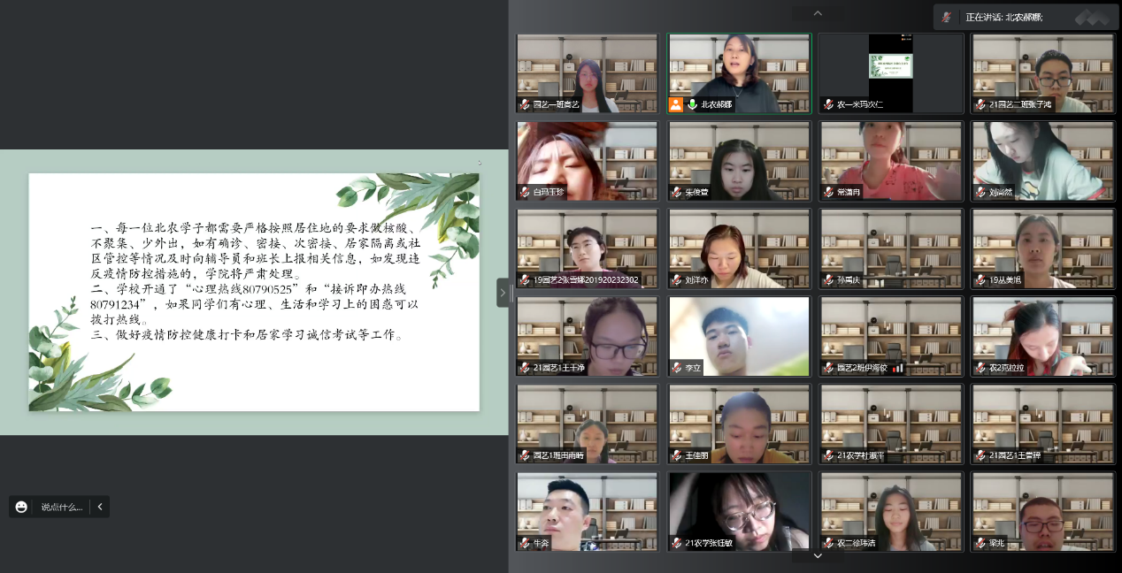 2022年6月11日、12日,公司召开疫情防控主题教育年级大会,本次大会覆盖全体本科生、研究生,分层次,分年级,分类型在线上召开。植物科学技术公司党总支书记王绍辉、党总支副书记牛奔、全体辅导员及全体员工参会。